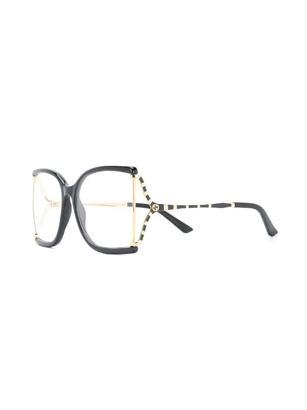 Lunettes de vue à monture oversize en acétate Gucci Eyewear avec design bicolore, branches droites à extrémités angulaires, logo sur les branches et détails dorés. Couleur : noir.