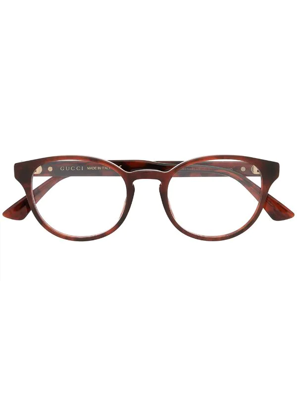 Monture ronde, plaque logo sur la branche, finitions en métal doré. Couleur : marron. Matière : acétate.