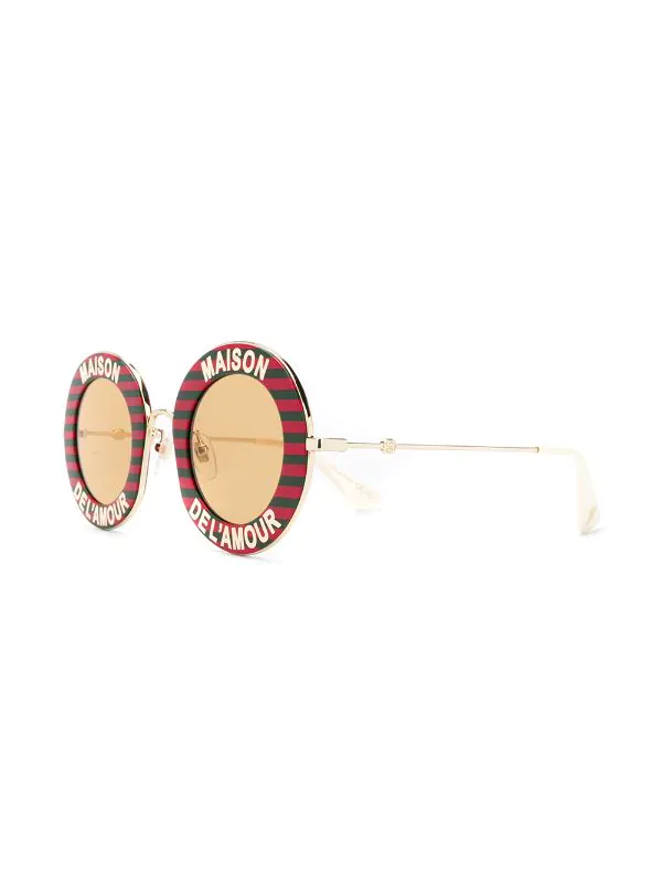 Lunettes de soleil Maison de l’Amour Gucci Eyewear avec rayures, monture ronde, finitions dorées, verres teintés et branches droites à extrémités angulaires. Ce produit est vendu dans une boîte de protection.