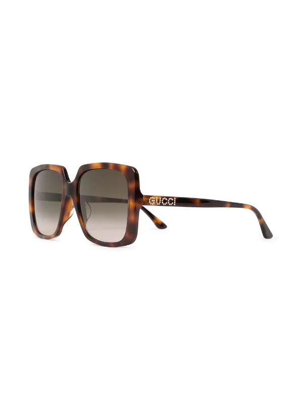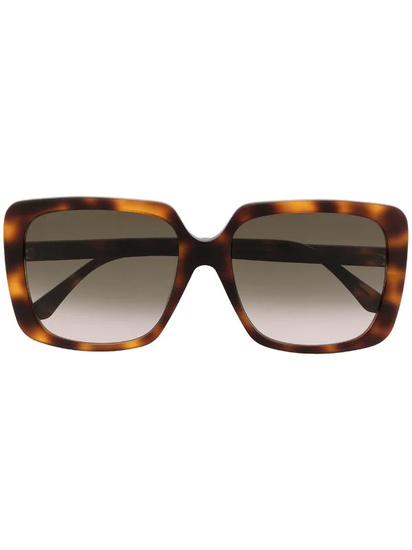 Marron, effet écaille de tortue, monture rectangulaire, verres dégradés, logo gravé sur la branche, extrémités incurvées. Ces lunettes sont livrées avec un étui de protection.