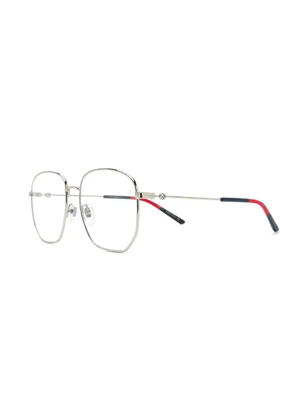 Lunettes à monture hexagonale Gucci Eyewear avec logo GG entrelacé, branches droites à extrémités angulaires et détail Sylvie Web bleu, rouge et blanc. Couleur: argenté. Ce produit est vendu dans une boîte de protection.