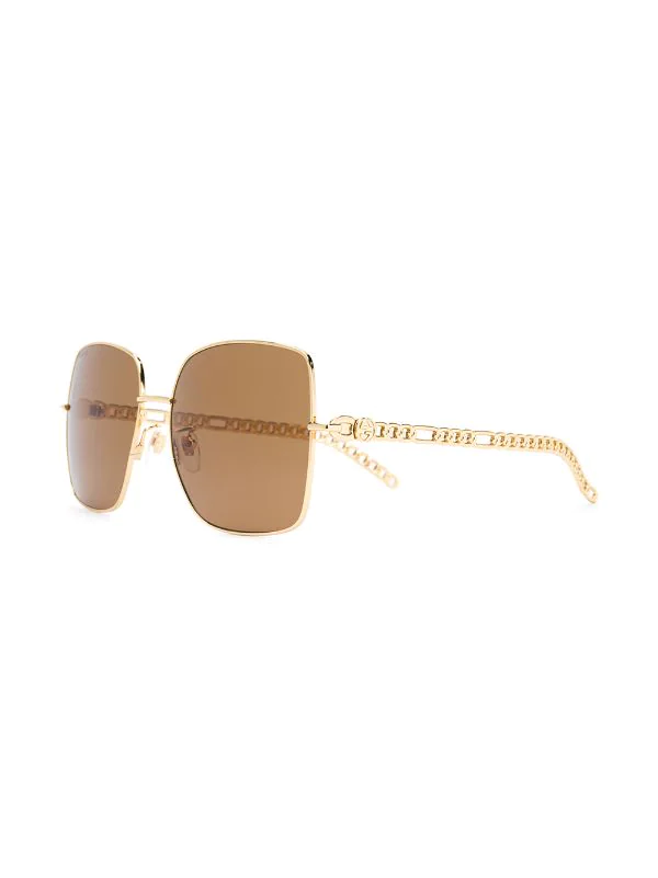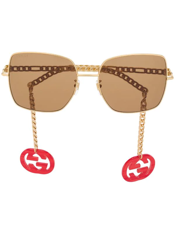 Monture carrée, verres teintés marron, plaquettes de nez, plaque logo sur la branche, détails de chaînes, breloque à logo, verres filtre UV. Matière : métal. Même s’il est évident que vous en prendrez bien soin, cet article vous parviendra dans une boîte de protection.