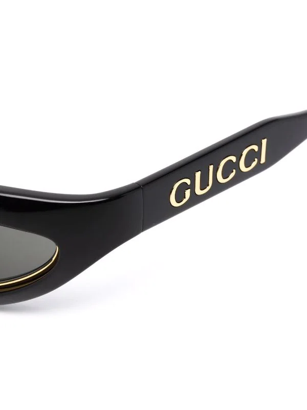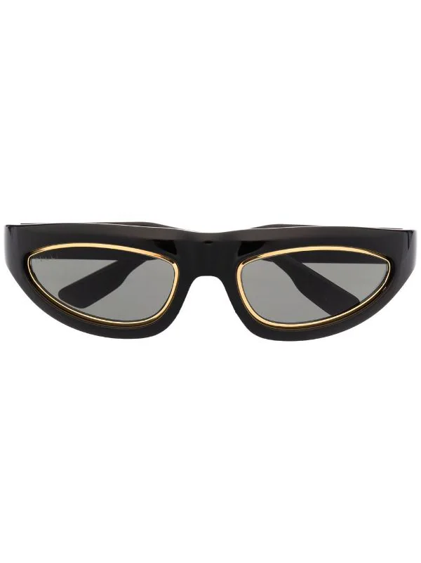 Finitions en métal doré, plaque logo sur la branche, monture papillon, verres teintés, branches droites, extrémités incurvées. Couleur : noir. Matière : acétate. Ces lunettes sont livrées avec un étui de protection.