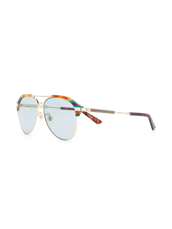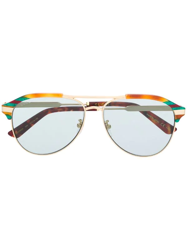 Monture aviateur, branches droites, plaquettes, verres teintés bleus, verres filtre UV. Couleur : marron. Même s’il est évident que vous en prendrez bien soin, cet article vous parviendra dans une boîte de protection. Gardez l’œil ouvert : toutes les lunettes achetées sur Farfetch sont fournies avec des verres sans prescription..