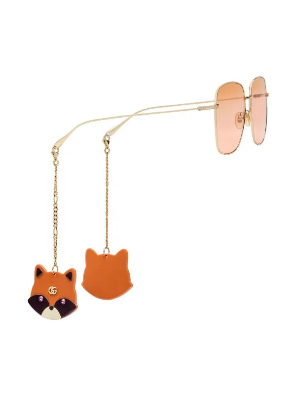 Verres teintés orange, monture carrée, détails de chaînes. Ces lunettes sont livrées avec un étui de protection.