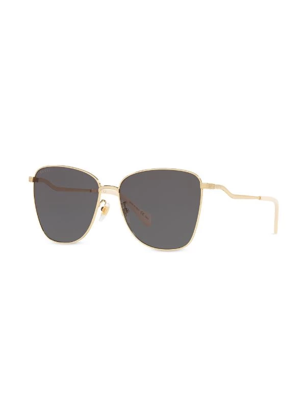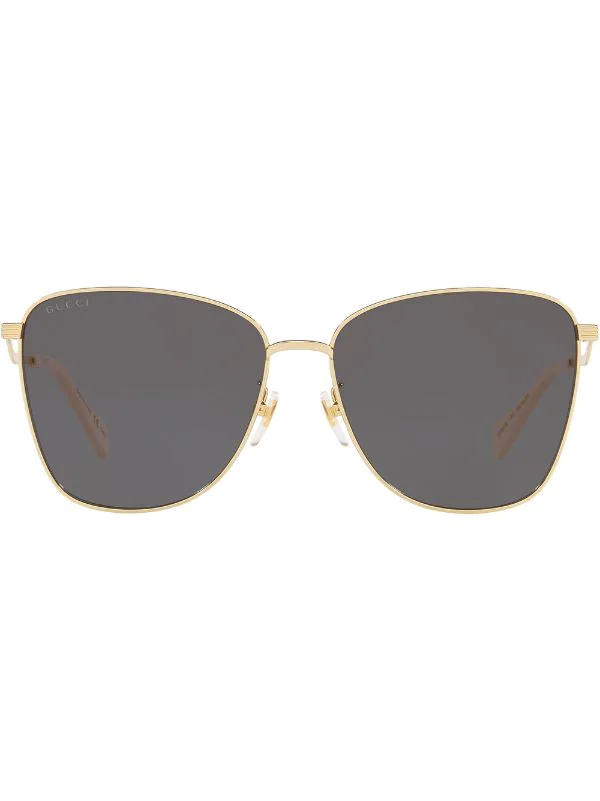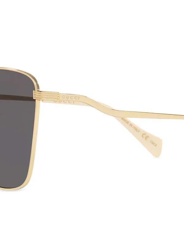 Logo gravé sur la branche, monture carrée, verres teintés, plaquettes de nez. Matière : métal. Ces lunettes sont livrées avec un étui de protection.