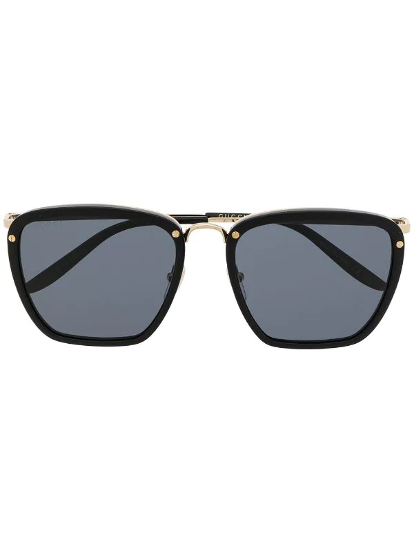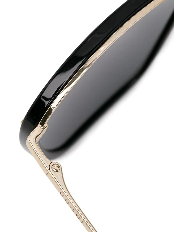 Monture carrée, finitions en métal doré, verres teintés, plaquettes de nez, branches incurvées, logo gravé, verres filtre UV. Couleur : noir. Ces lunettes sont livrées avec un étui de protection.