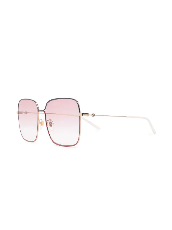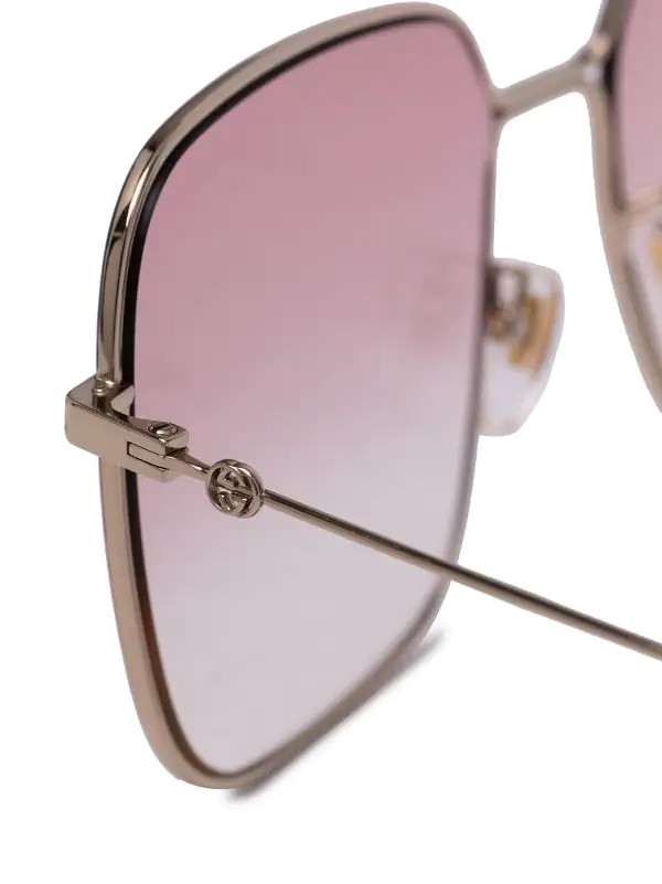 Rose, monture carrée, plaque logo, verres filtre UV, verres teintés roses, extrémités incurvées. Ces lunettes sont livrées avec un étui de protection.