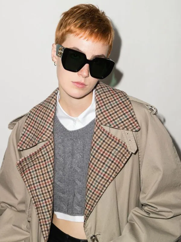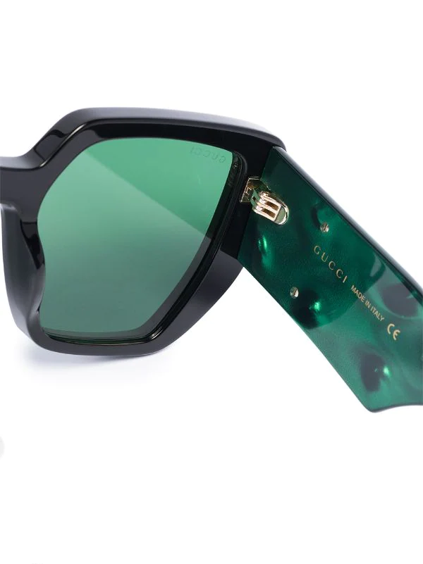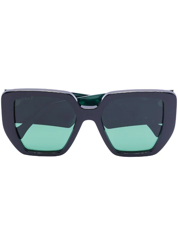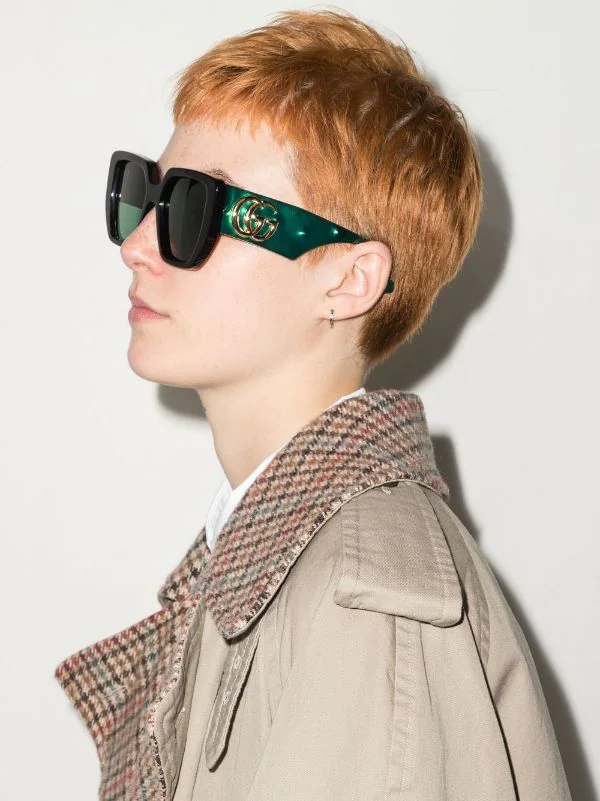 Monture carrée, verres teintés verts, branches oversize, logo Double G signature, extrémités incurvées, verre à détail de décalque. Couleur : vert. Matière : acétate.