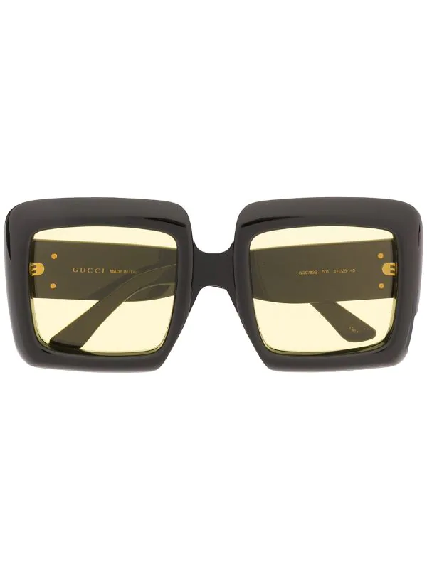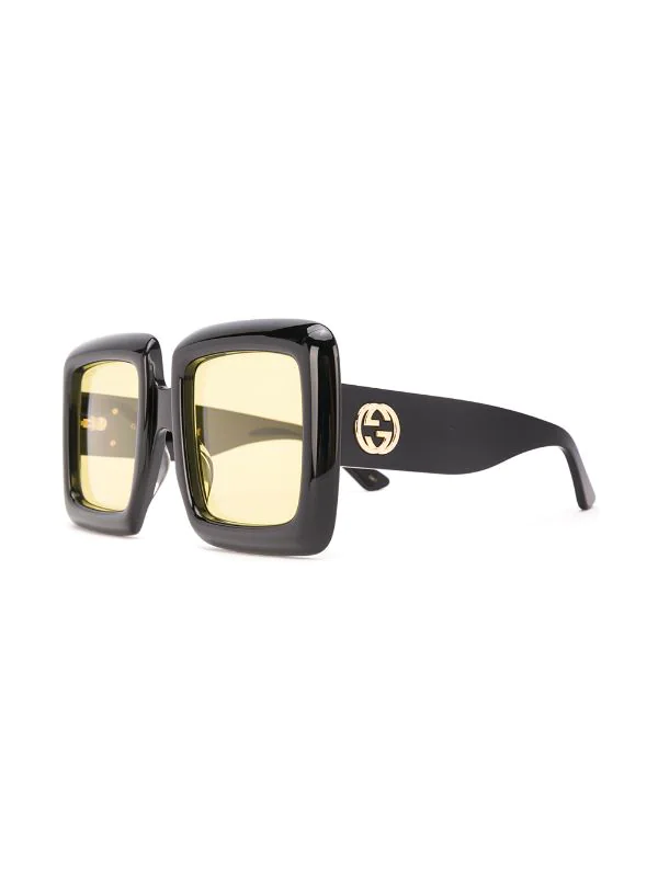 Plaque logo sur la branche, finitions en métal doré, verres teintés jaunes, monture carrée, monture oversize. Matière : acétate.