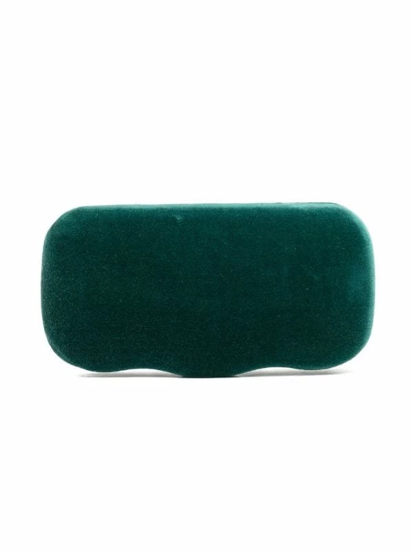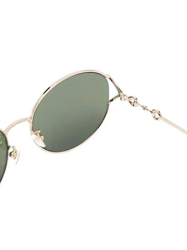 Verres teintés verts, plaquettes de nez, branches droites, extrémités incurvées. Matière : gunmétal. Ces lunettes sont livrées avec un étui de protection.