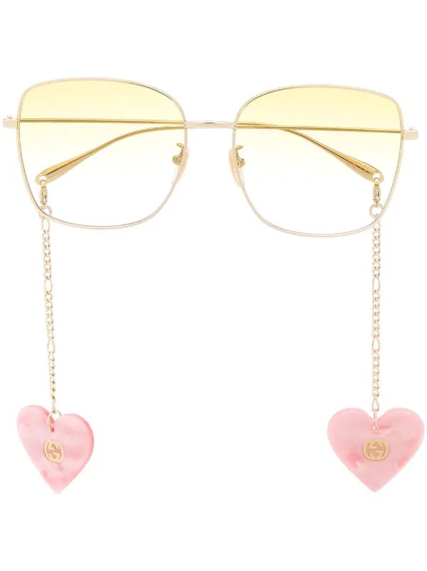Verres dégradés, monture oversize, pendentif cœur, plaquettes de nez, branches droites, extrémités incurvées. Couleur : or. Ces lunettes sont livrées avec un étui de protection.