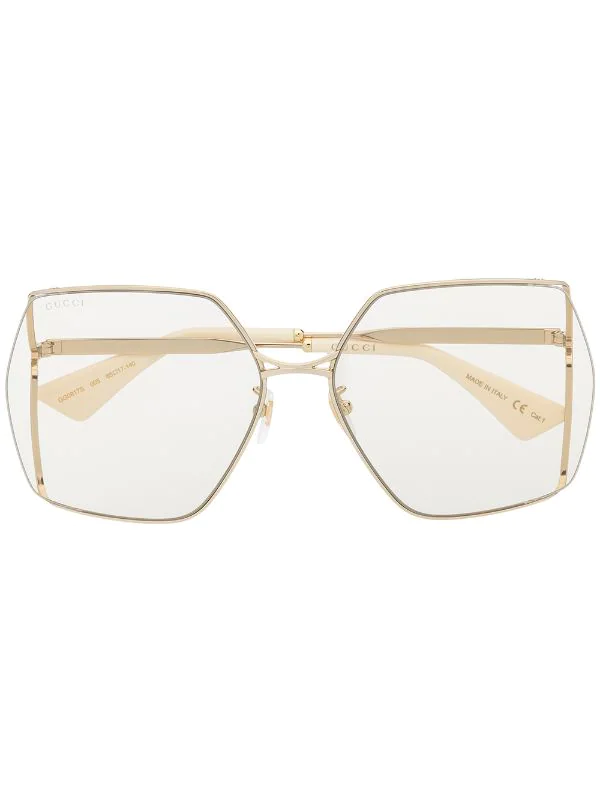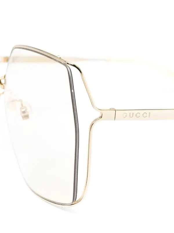 Monture oversize, verres teintés jaunes, finitions en métal doré, plaquettes de nez, extrémités incurvées.