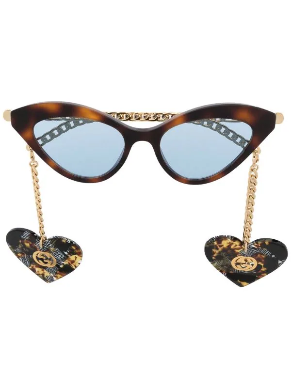 Monture papillon, verres teintés, détails de chaînes, finitions en métal doré. Couleur : marron. Matière : acétate.