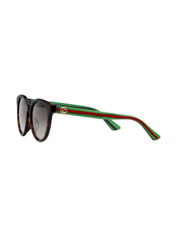 Effet écaille de tortue, détail de rayure latérale, logo GG signature, monture ronde, verres teintés gris. Couleur : marron. Matière : acétate. Ces lunettes sont livrées avec un étui de protection.