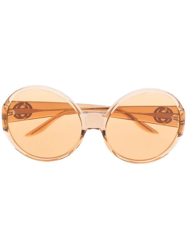 Monture ronde, verres teintés, plaque logo sur la branche, finitions en métal doré. Couleur : tons neutres. Matière : acétate.