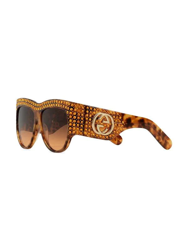 Lunettes de soleil à ornements en cristal Gucci Eyewear avec monture oversize, verres dégradés et logo doré sur les branches. Couleur : marron.