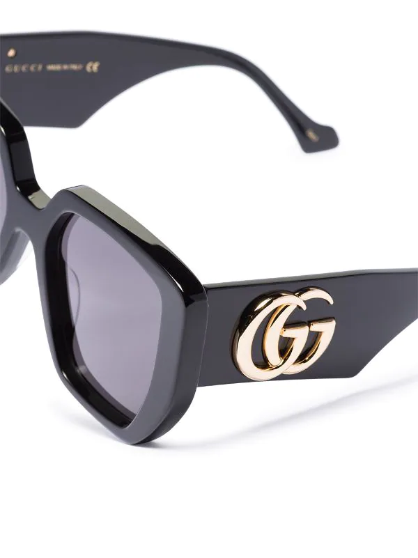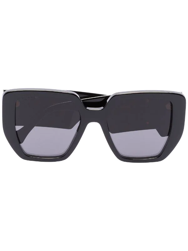 Logo Double G signature, monture oversize, verres teintés gris, verres filtre UV, branches oversize, branches droites. Couleur : noir. Matière : acétate. Ces lunettes sont livrées avec un étui de protection.