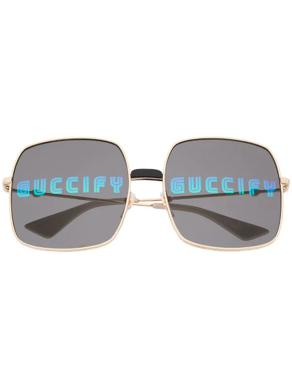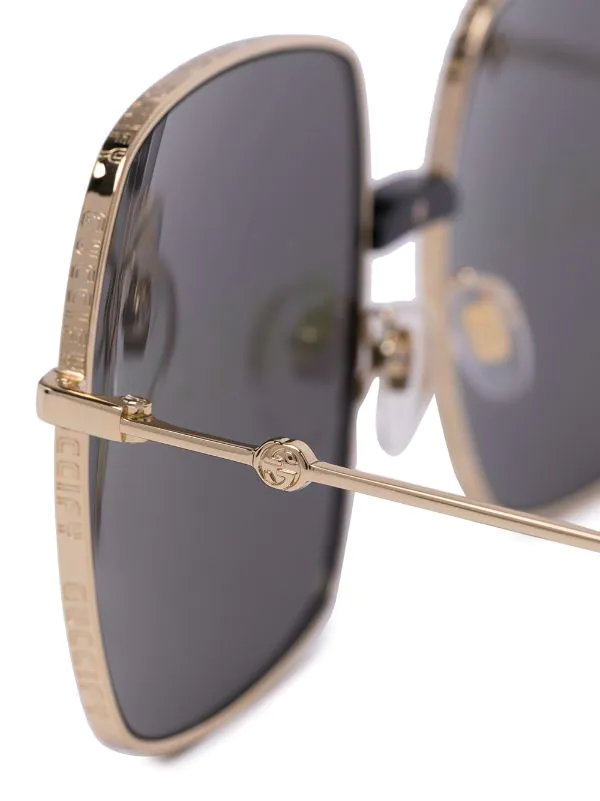 Doré, acier inoxydable, monture rectangulaire, slogan imprimé, plaquettes de nez, verres teintés, plaque logo sur la branche, extrémités incurvées. Ces lunettes sont livrées avec un étui de protection.