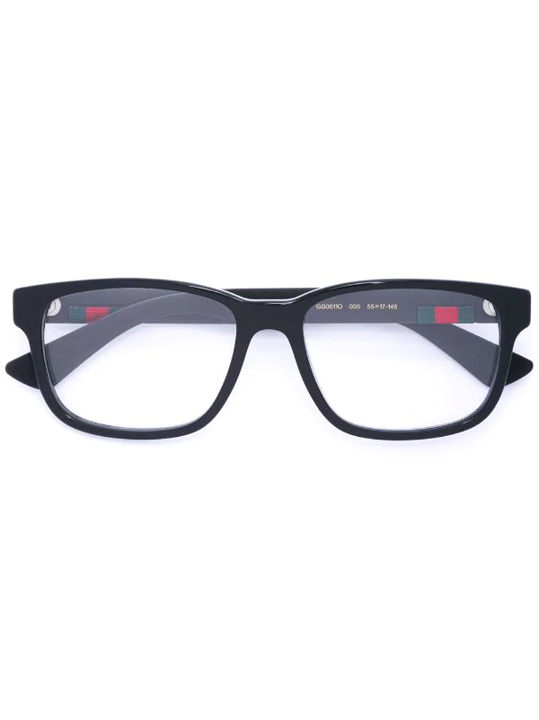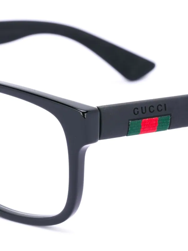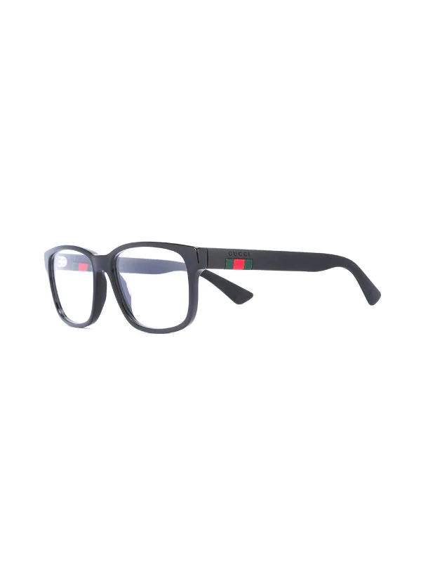 Lunettes de vue en acétate et caoutchouc noirs à détail Web Gucci Eyewear avec monture rectangulaire, logo embossé sur le côté et branches droites à extrémités incurvées. Ce produit est vendu dans une boîte de protection.