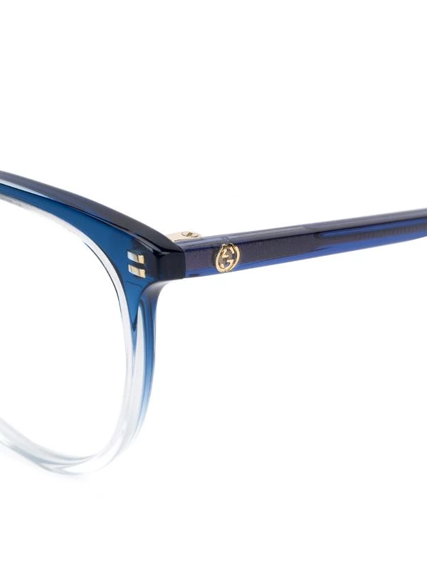 Blue gradient soft round-frame glasses from Gucci Eyewear featuring gradient effect, clear lenses, signature interlocking GG logo, straight arms, curved tips and soft-round frame. Don’t be short sighted! All glasses from Farfetch are bought as non-prescription frames.. We know you’ll look after them, but these glasses come with protection, just in case.