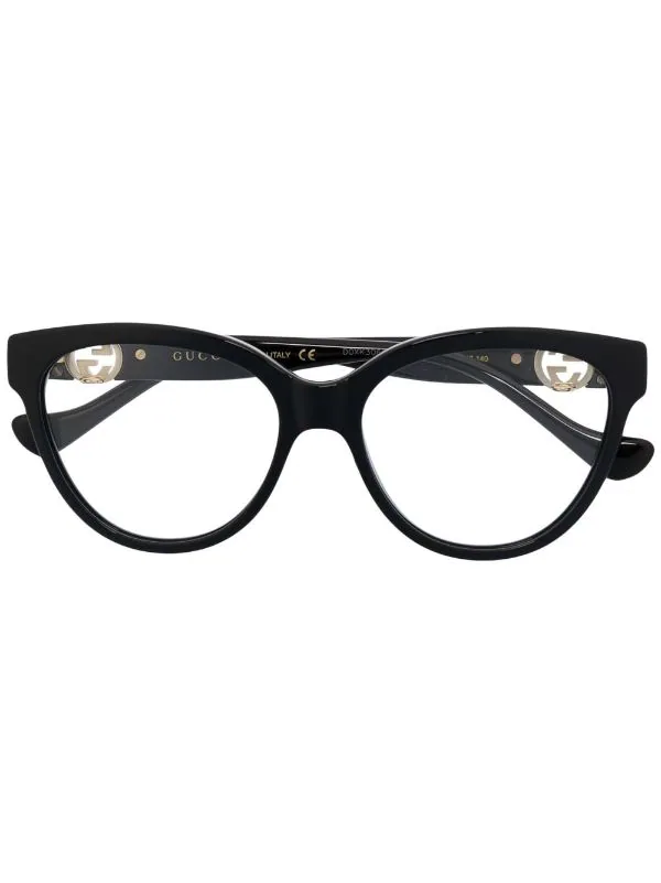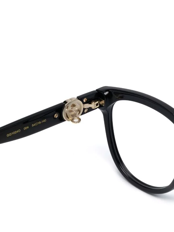 Monture ronde, verres transparents, plaque logo sur la branche, finitions en métal doré. Couleur : noir.