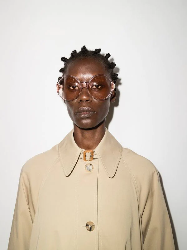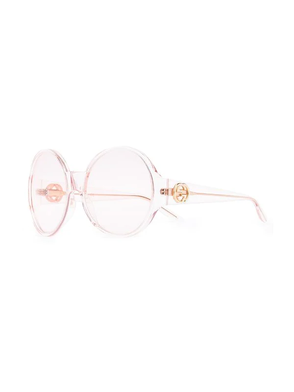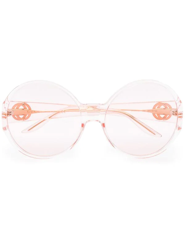 Logo GG signature, monture à effet de transparence, monture ronde, verres teintés roses, verres filtre UV, branches droites, extrémités incurvées. Couleur : rose. Matière : acétate. Ces lunettes sont livrées avec un étui de protection.