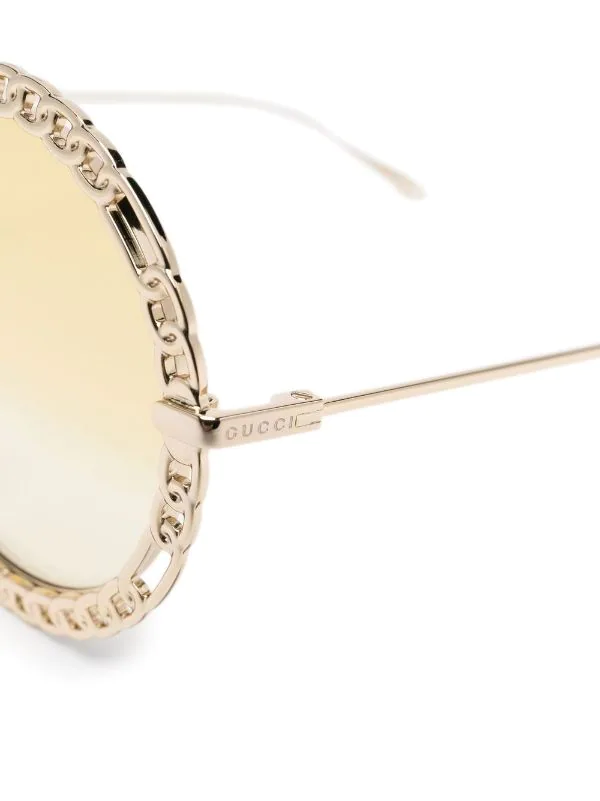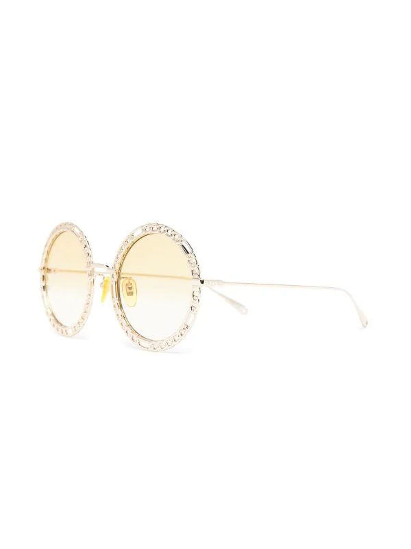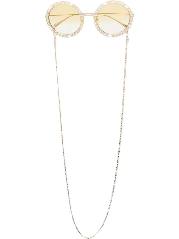 Or jaune, verres dégradés, monture ronde, ornement en cristal, lanière autour du cou à maillons, branches droites, extrémités incurvées. Ces lunettes sont livrées avec un étui de protection.