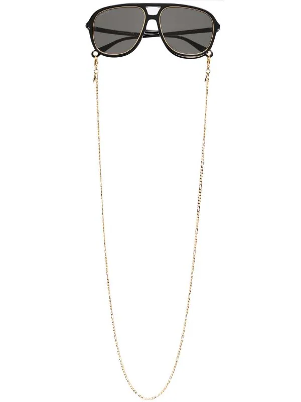Monture aviateur, verres teintés gris, lanière autour du cou à maillons, branches droites, extrémités incurvées. Couleur : noir. Ces lunettes sont livrées avec un étui de protection.