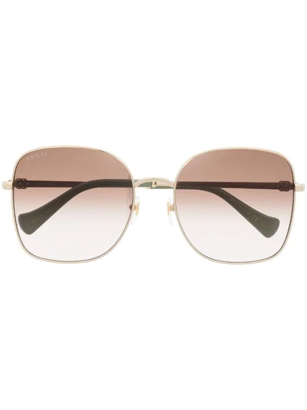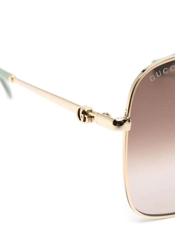 Doré, vert clair, monture carrée, verres dégradés, verre à détail de décalque, logo gravé sur la branche, branches droites, extrémités incurvées. Ces lunettes sont livrées avec un étui de protection.