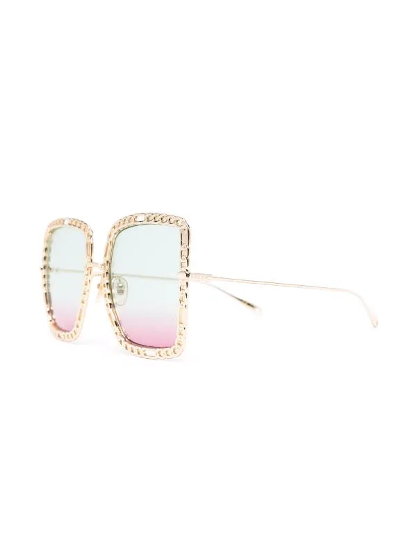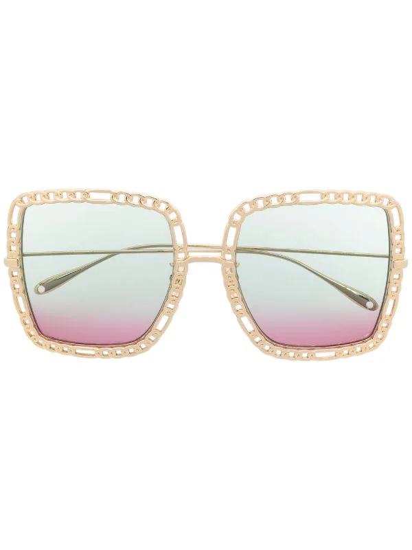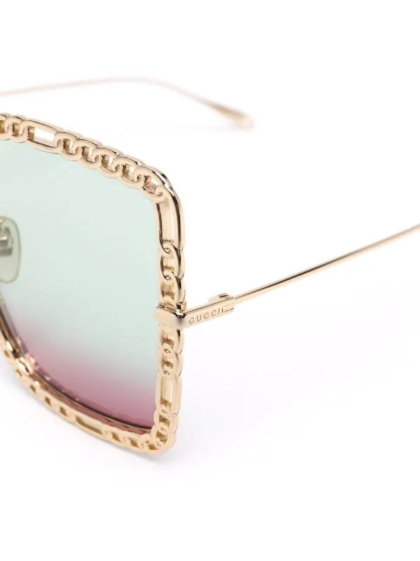 Effet dégradé, bordures en chaîne, monture carrée, extrémités incurvées. Ces lunettes sont livrées avec un étui de protection.