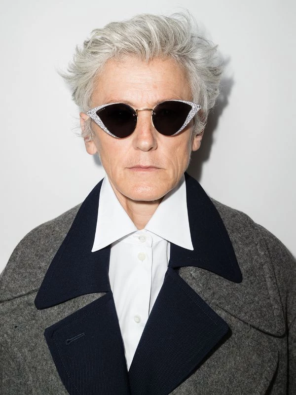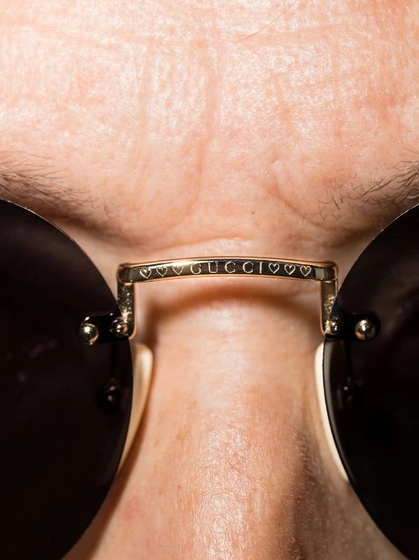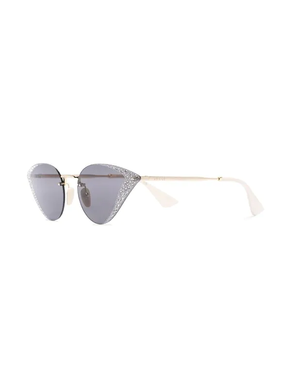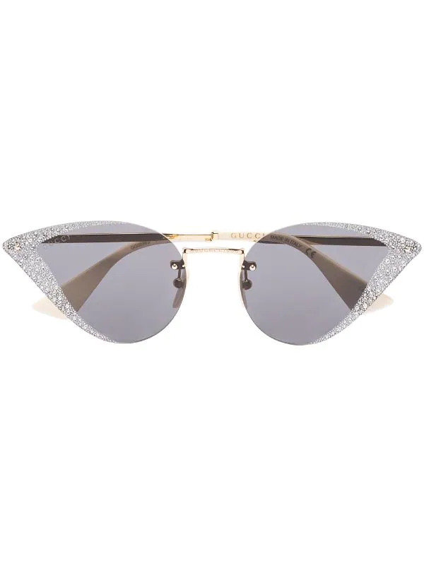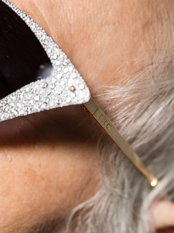Ornement en cristal, monture papillon, verres teintés gris, verres filtre UV, plaquettes de nez, logo gravé sur la branche, branches droites, extrémités incurvées. Ces lunettes sont livrées avec un étui de protection.