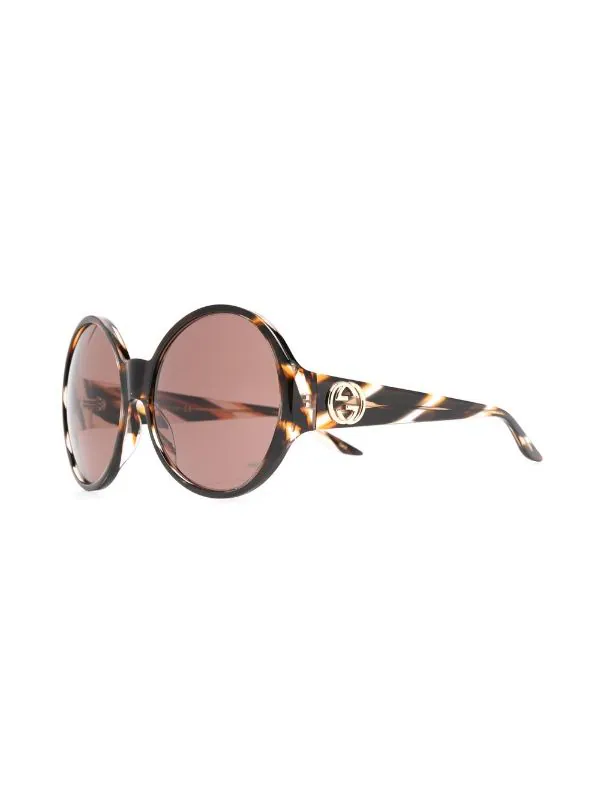 Effet écaille de tortue, monture ronde, verres teintés marron, plaque logo sur la branche, branches droites, extrémités incurvées. Couleur : marron. Ces lunettes sont livrées avec un étui de protection.