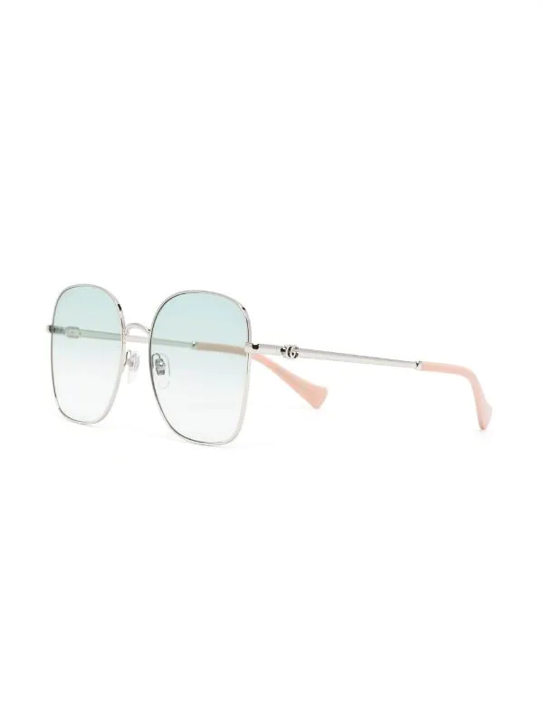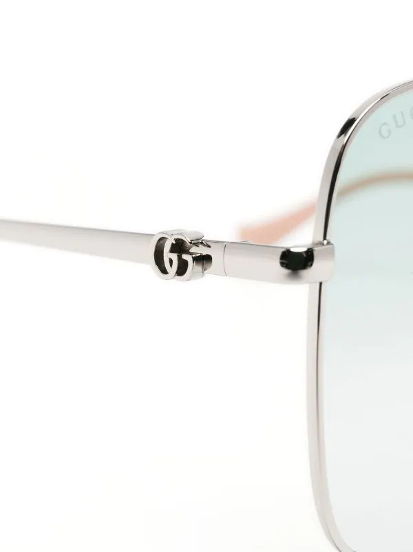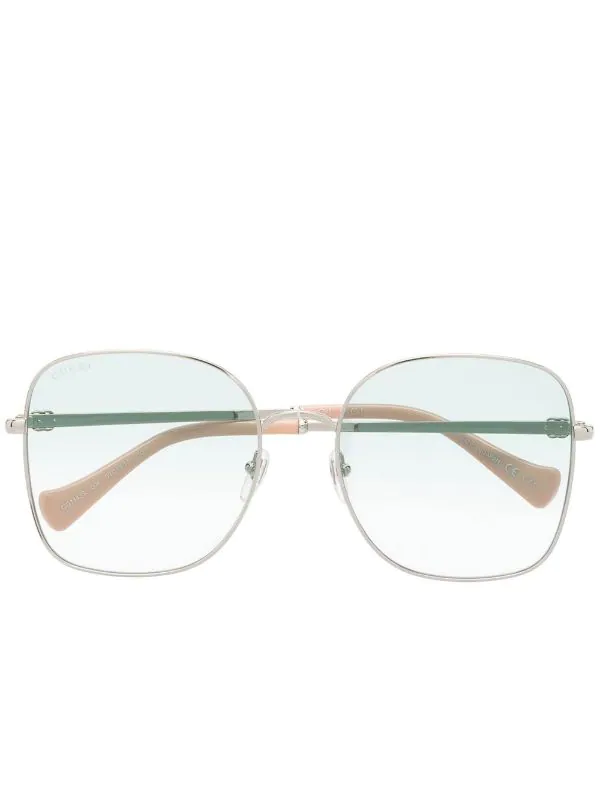 Fini poli, plaque logo sur la branche, monture oversize, verres teintés bleus, branches droites, extrémités incurvées. Ces lunettes sont livrées avec un étui de protection.