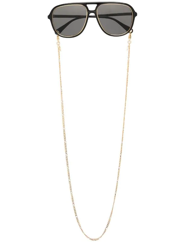 Noir, verres teintés, monture aviateur, double pont, branche à logo imprimé, lanière autour du cou à maillons, branches droites, extrémités incurvées. Ces lunettes sont livrées avec un étui de protection.