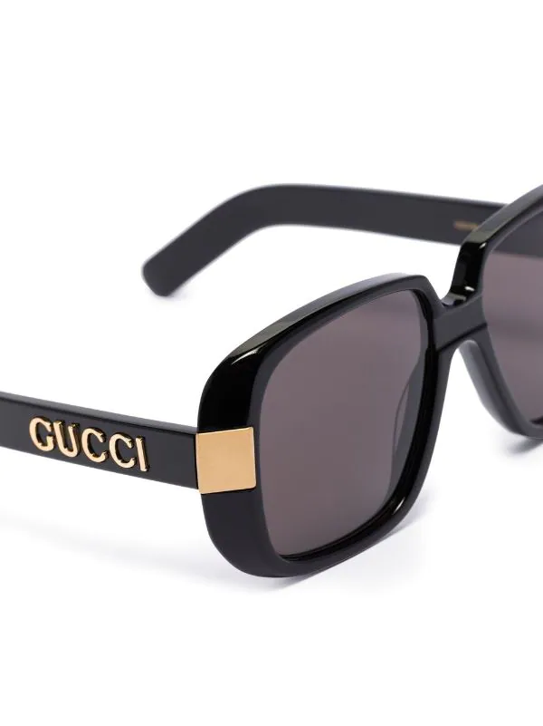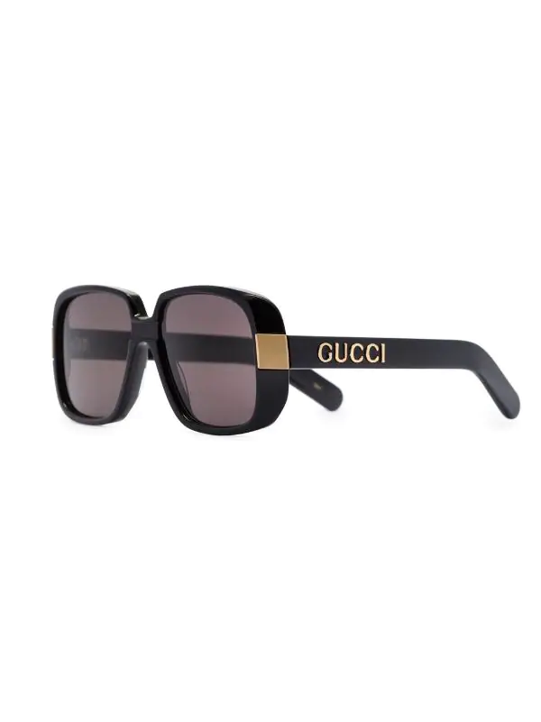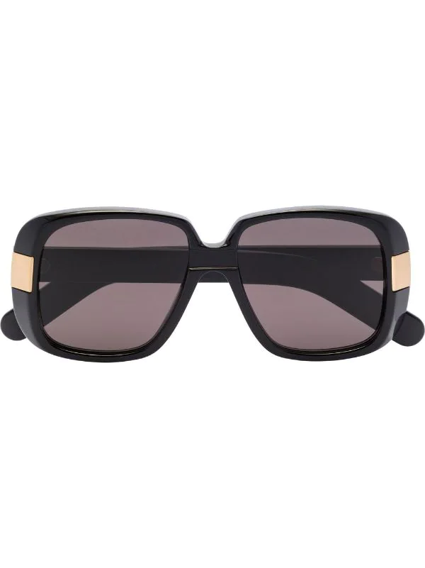 Monture oversize, verres teintés, finitions en métal doré, plaque logo sur la branche, branches droites, extrémités incurvées. Couleur : noir. Matière : acétate. Ces lunettes sont livrées avec un étui de protection.